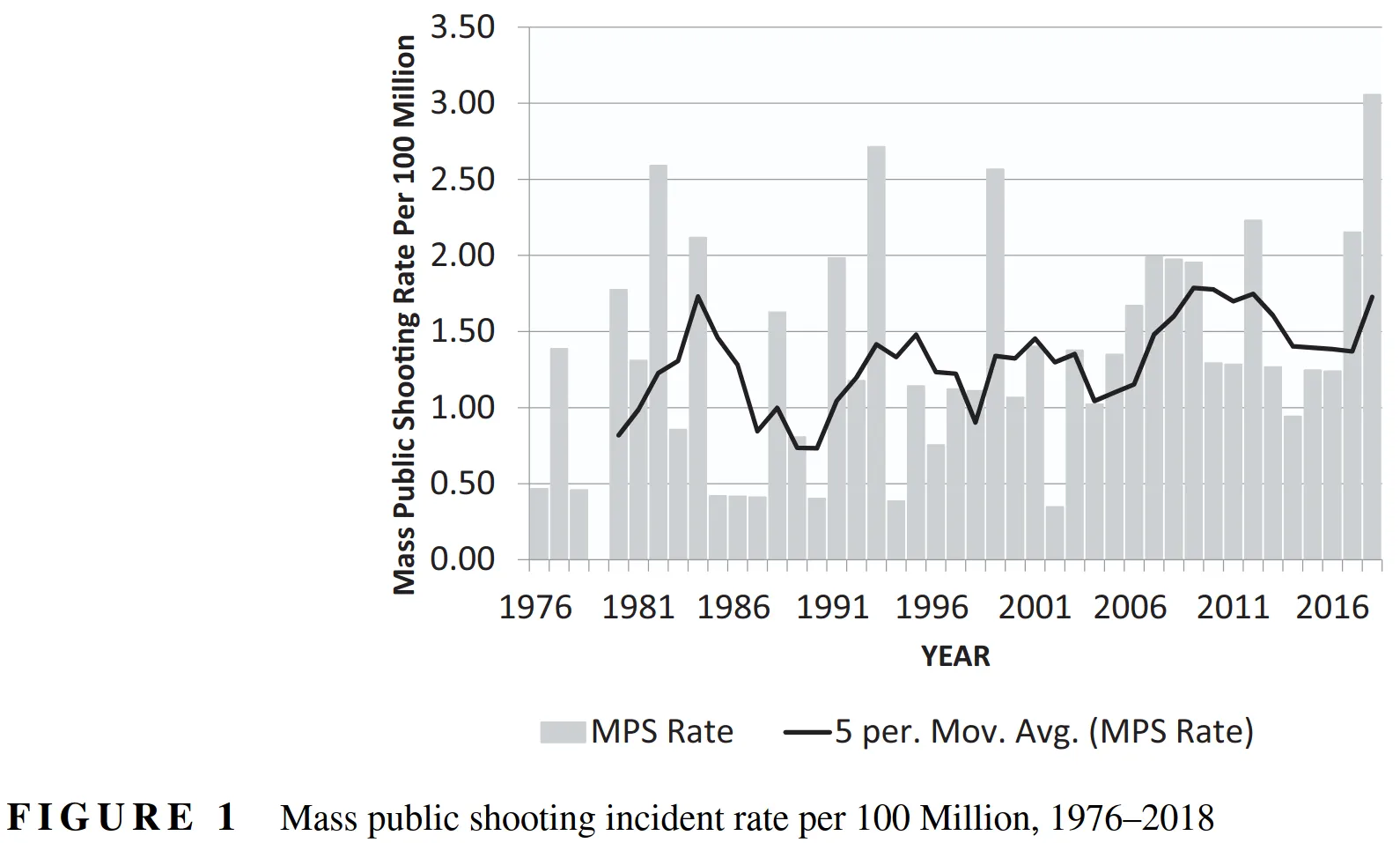 A figure from a 2019 study shows that the rate of mass public shootings did not substantially decrease during the nationwide assault rifle ban from 1994 to 2004.